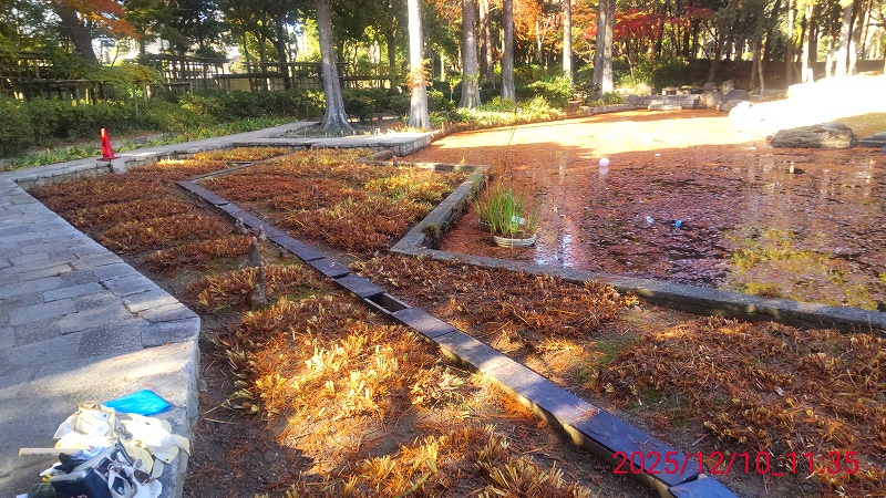 枯れた葉を中心に2/3程度刈り取りました。また花壇中央水路の蓋を再塗装しました。